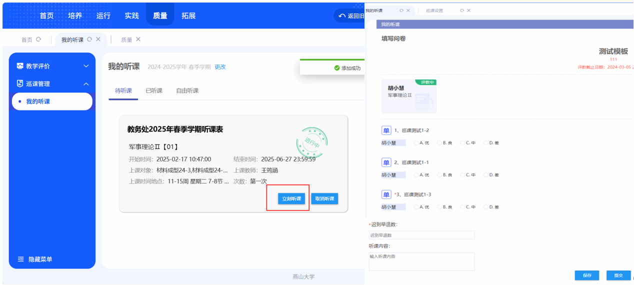 (2)【我的听课】【待听课】中,选择课程右侧【立即听课】按钮中后,会跳转到听课表页面,问卷可以暂存或提交。【已听课】可以看到当前学年学期的听课记录。
