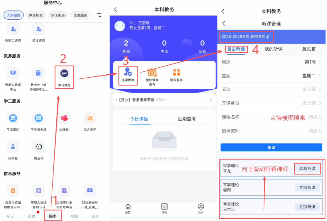 进入今日校园APP,选择“服务-教务服务-本科教务—巡课管理”,进入听课管理界面,确认学期,可在“自由听课”模块录入听课信息,“我的听课”模块查看已选择/已填写/已提交的问卷。