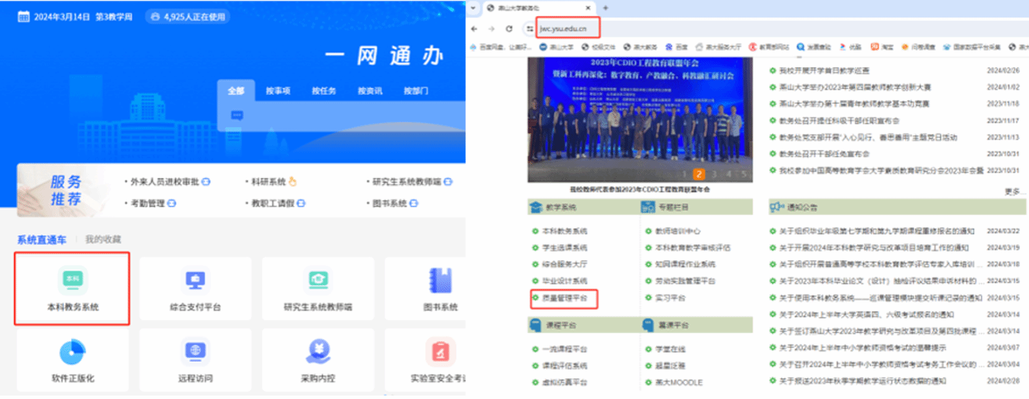 用教师工号登录一网通办,选择“本科教务系统”,或在燕山大学教务处网页下,点击“质量管理平台”。在“质量”模块下选择“教学评价-巡课管理-我的听课-自由听课”进行听课表录入。注意页面右上角组别,请选择教职工个人组。