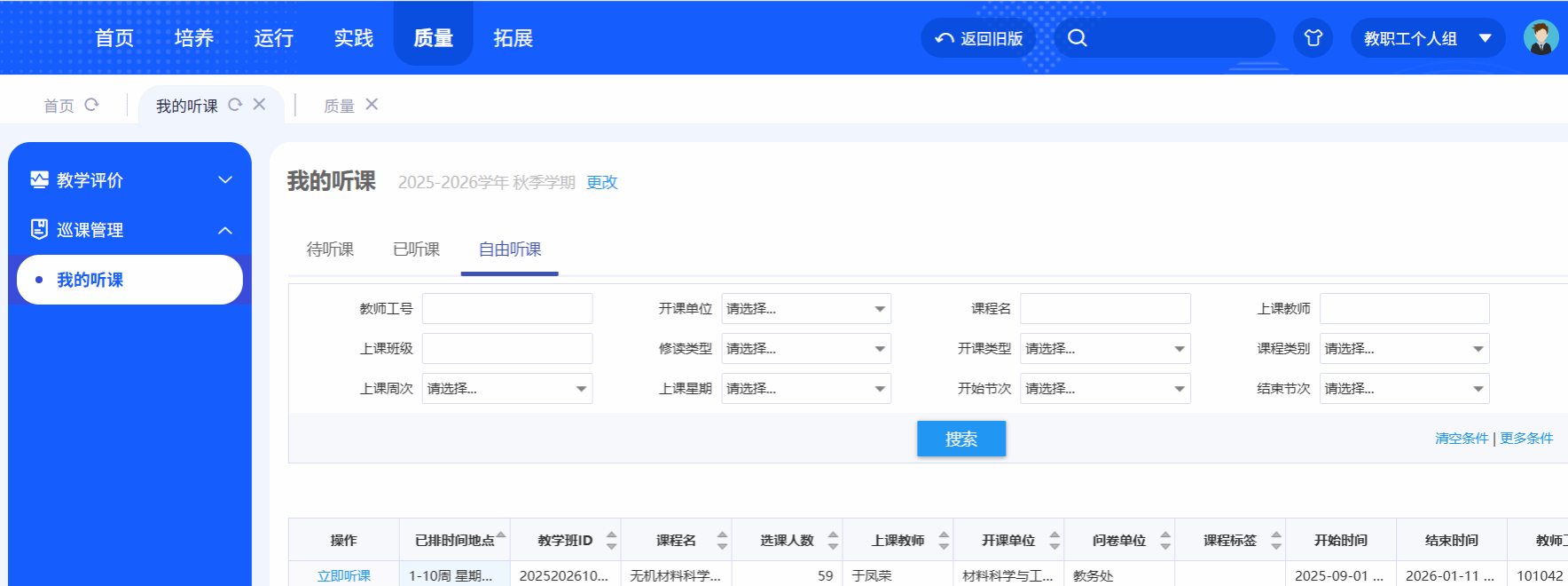 (1)【自由听课】为听课人员自行选择教学任务进行听课信息录入。请先确认正确的学年学期。输入字段支持模糊搜索,选择立即听课跳转听课表页面。